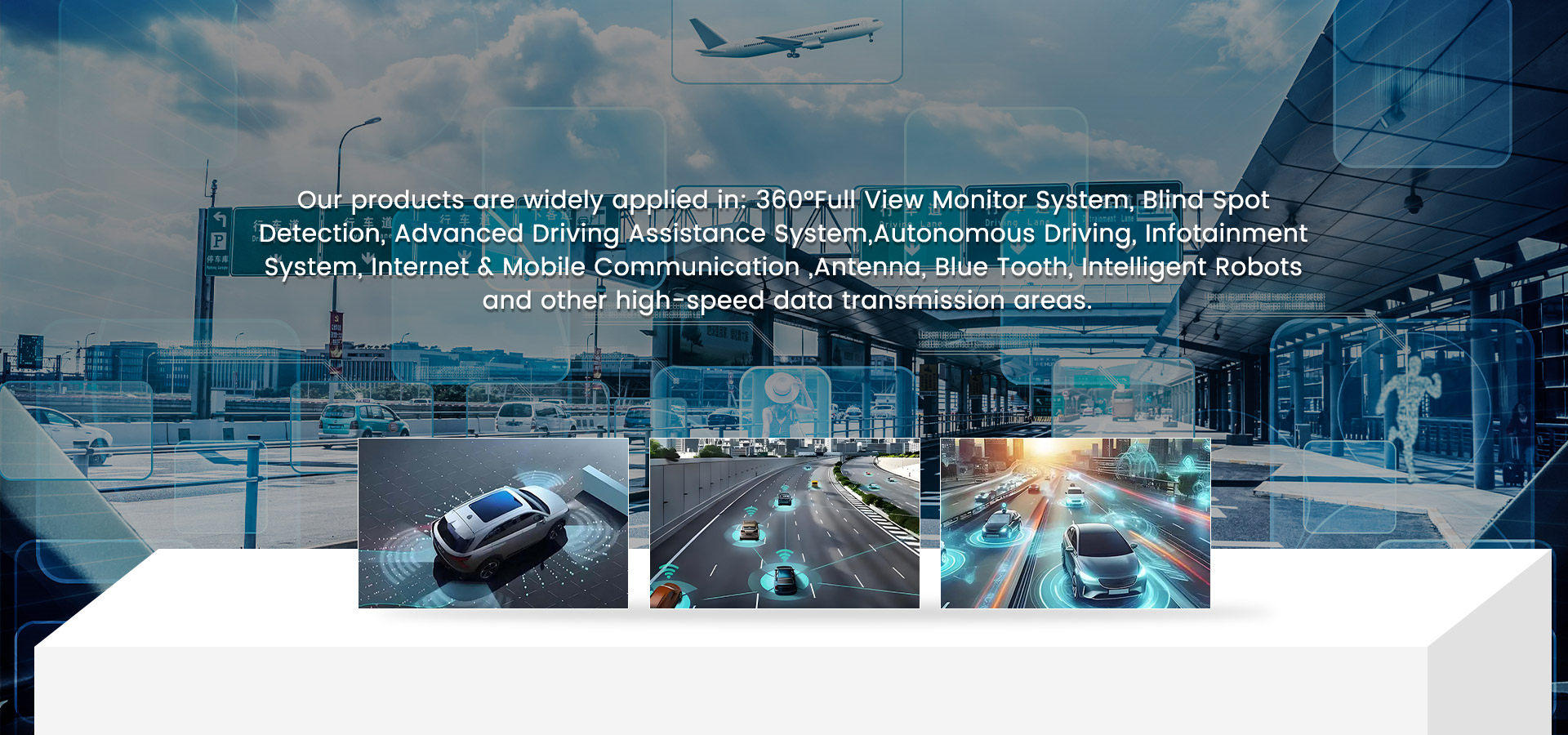 Our products are widely applied in: 360°Full View Monitor System, Blind Spot Detection, Advanced Driving Assistance System,Autonomous Driving, Infotainment System, Internet & Mobile Communication ,Antenna, Blue Tooth, Intelligent Robots and other high-speed data transmission areas.